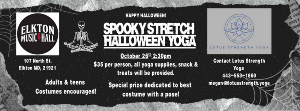 Join us at Elkton Music Hall for a special Halloween-themed yoga night filled with spooky stretches, playful poses, and lots of festive fun.